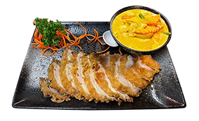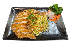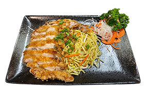 Gebratene Eiernudeln mit paniertem Hähnchen